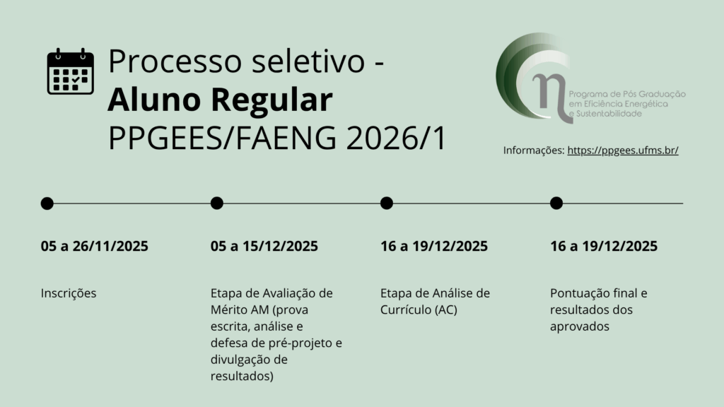 Divulgamos a abertura do processo seletivo para o Programa de Pós-graduação em Eficiência Energética e Sustentabilidade (PPGEES) da FAENG, que faz parte do Processo Seletivo Unificado para os cursos de Pós-graduação da UFMS, para ingresso no primeiro semestre de 2026.